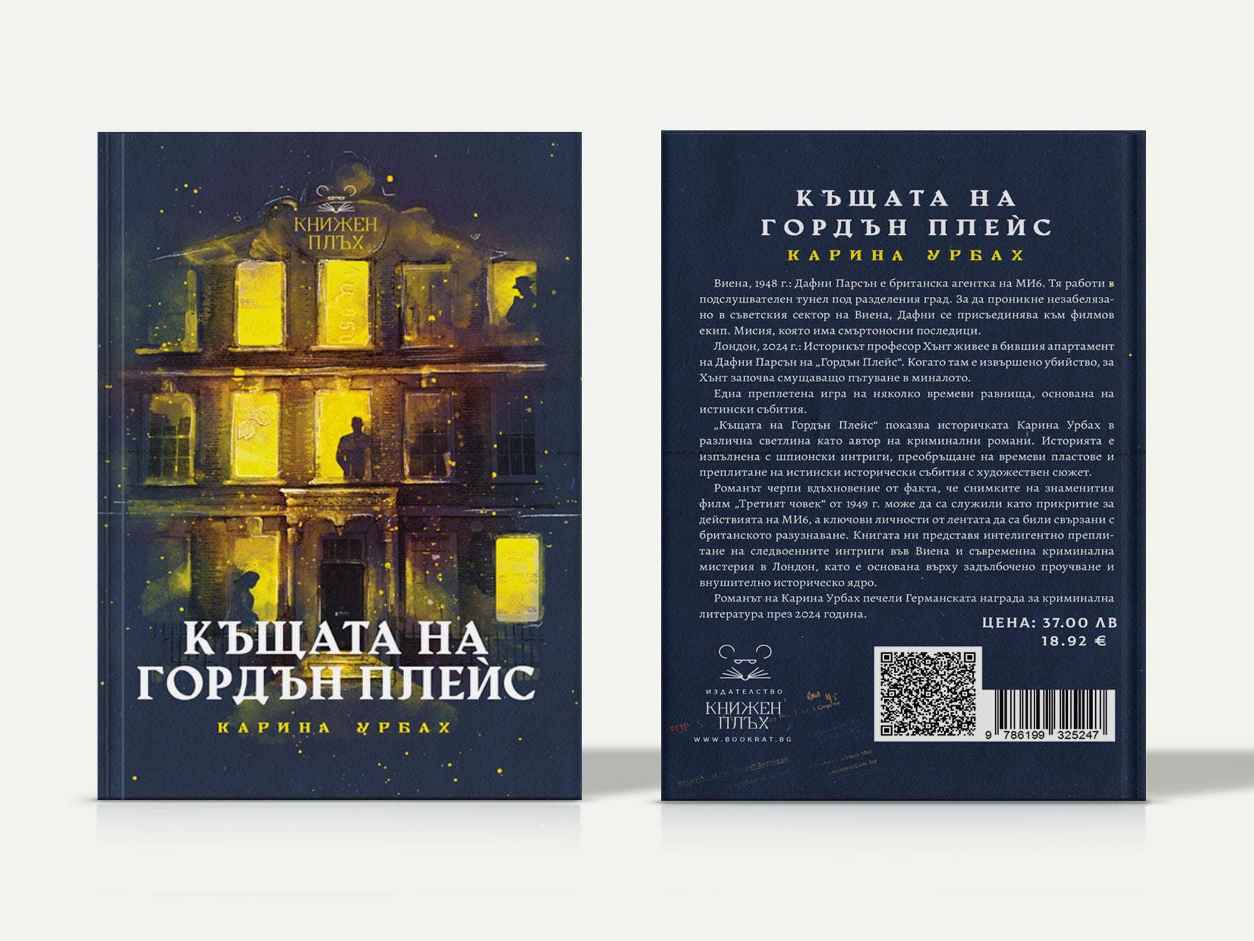 „Къщата на Гордън Плейс“ показва историчката Карина Урбах в различна светлина като автор на криминални романи. Историята е изпълнена с шпионски интриги, преобръщане на времеви пластове и преплитане на истински исторически събития с художествен сюжет.